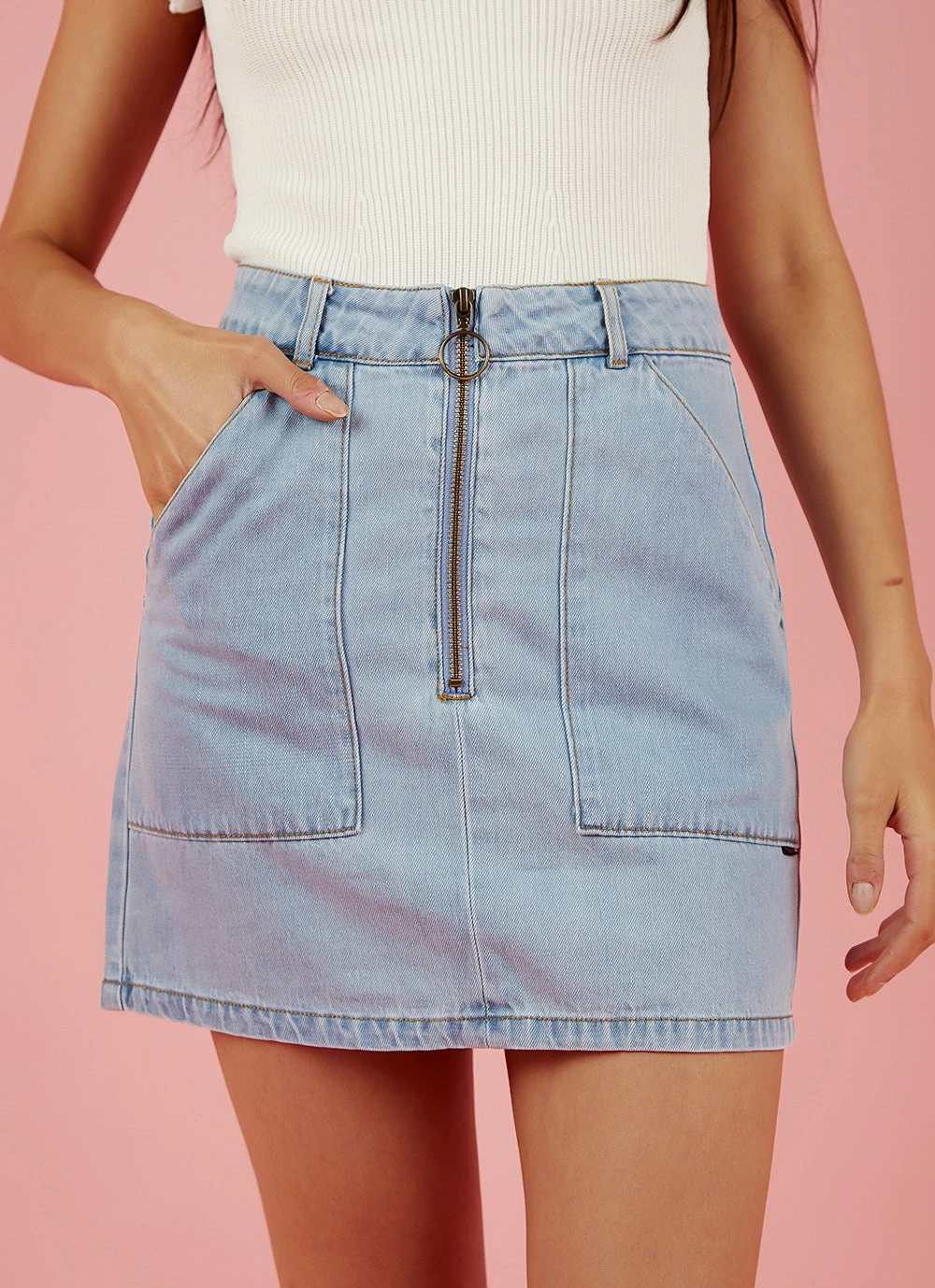 With a modern feel, this utility meets street denim skirt features an exposed zipper with ring pull and rectangular patch pockets. Finished with the signature Afends paper patch on the waistband and belt loops to allow it to be worn higher on the waist and styled with a belt and crop.