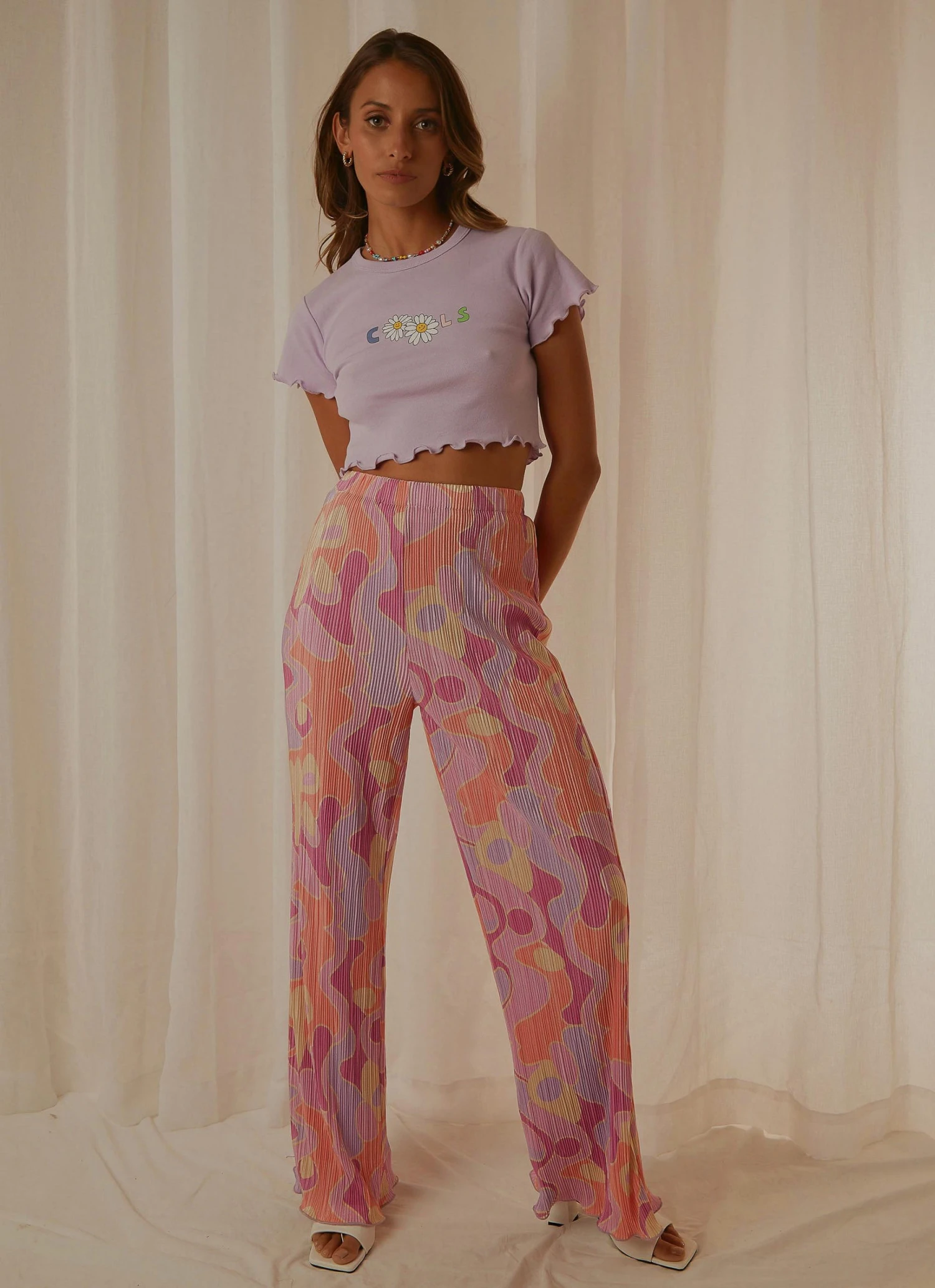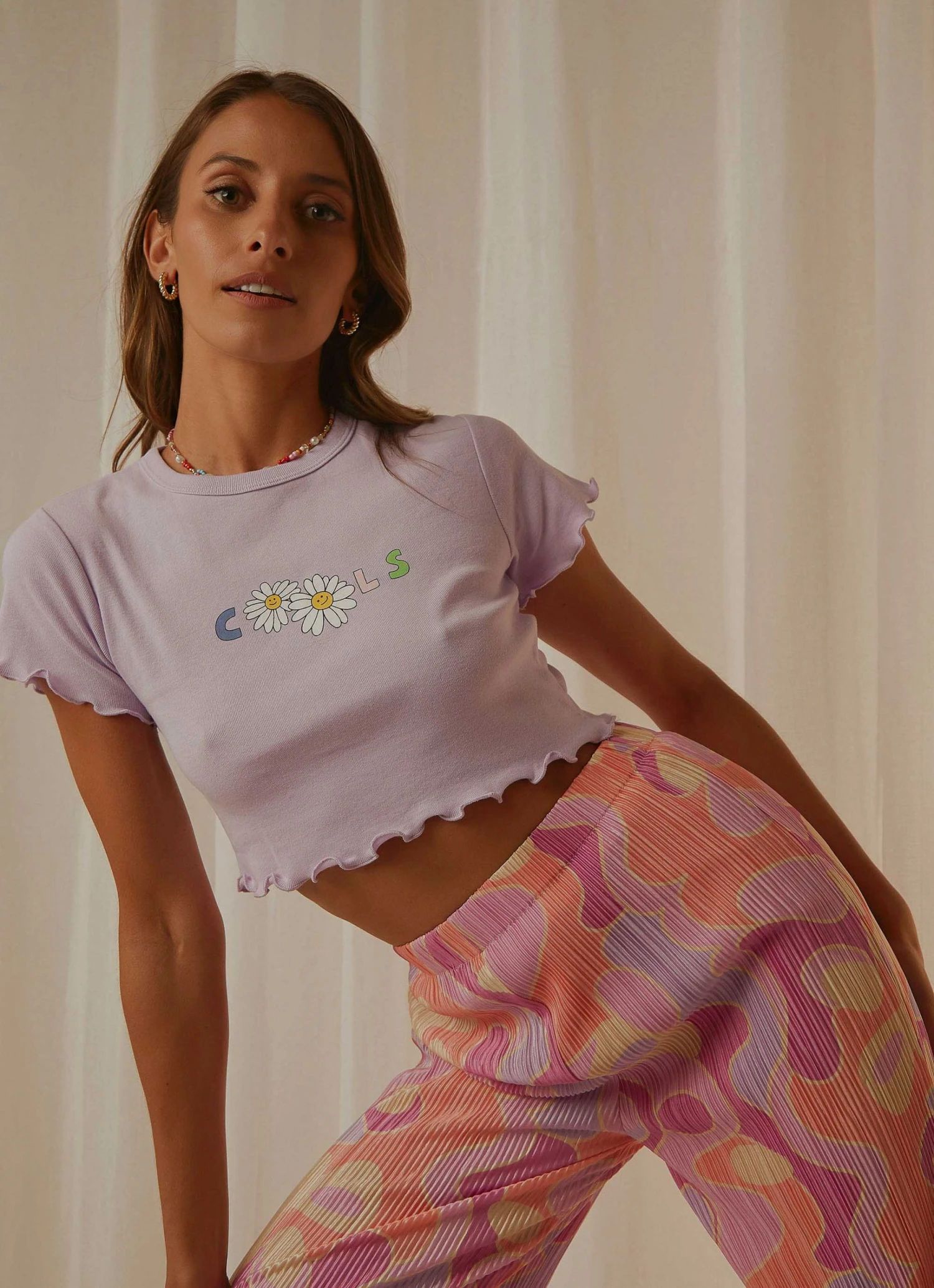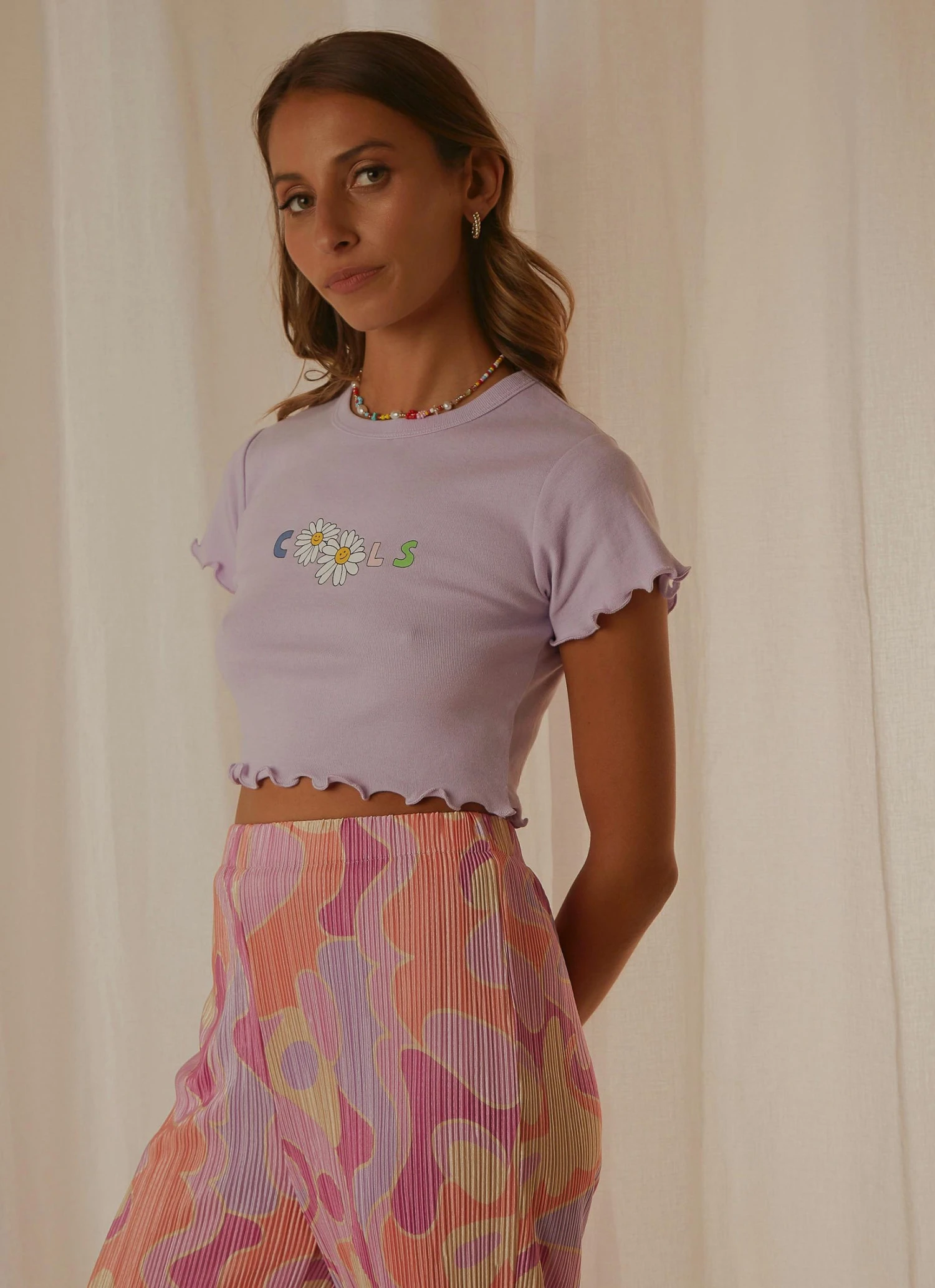 The Daisy Club Tee in Lilac features a crew neck silhouette built in a slim fit with lettuce-edge trim at the cropped hem with short sleeves. Finished with our colourful daisy chest print.