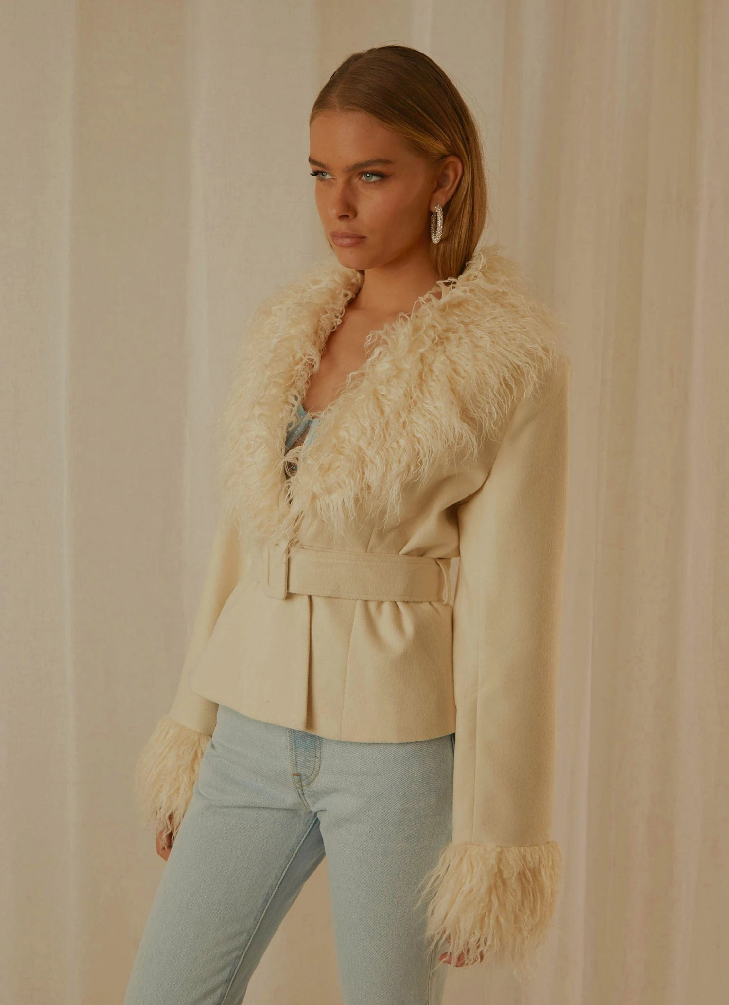A trip down memory lane with the Maddy Faux Fur Jacket. A 70’s inspired jacket featuring shaggy lapel, collars and cuffs. Single internal button closure with belt and buckle. Complete the retro look with a cropped white tank high waisted vintage denim.