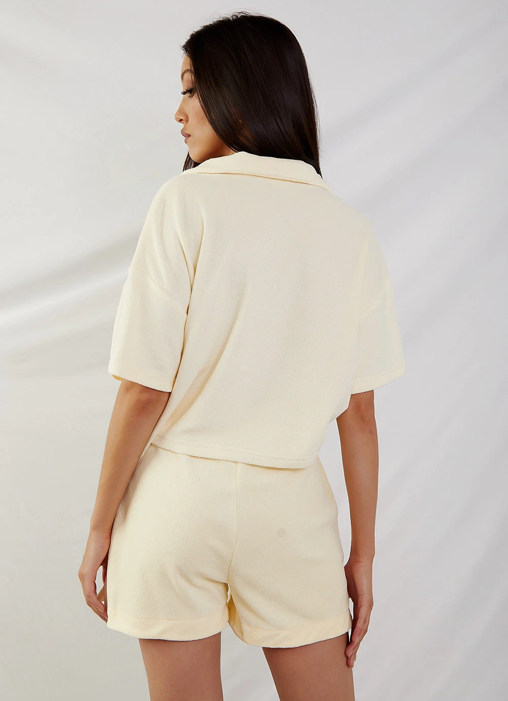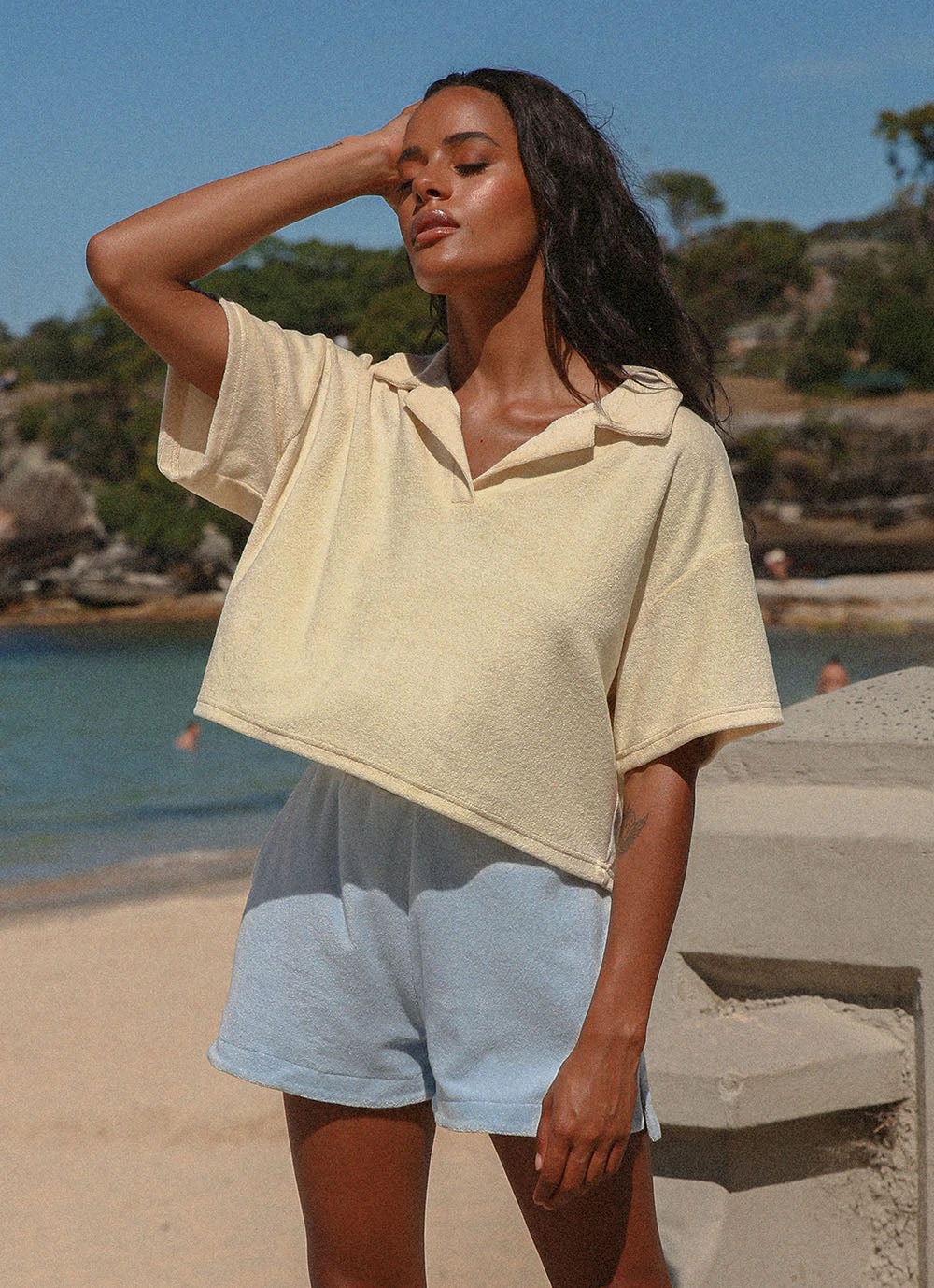 The Provence Collared Top will be your new go to for beach day dressing- Just add slides, the St Tropez Terry Shorts and Vintage inspired shades.