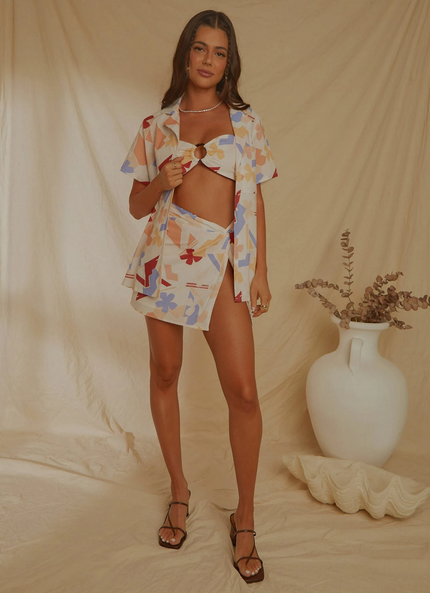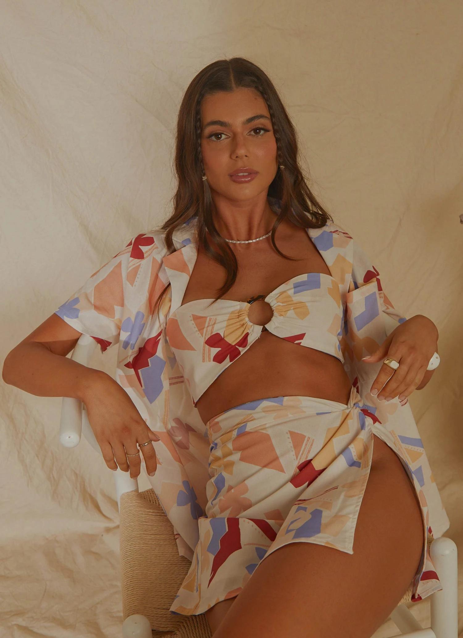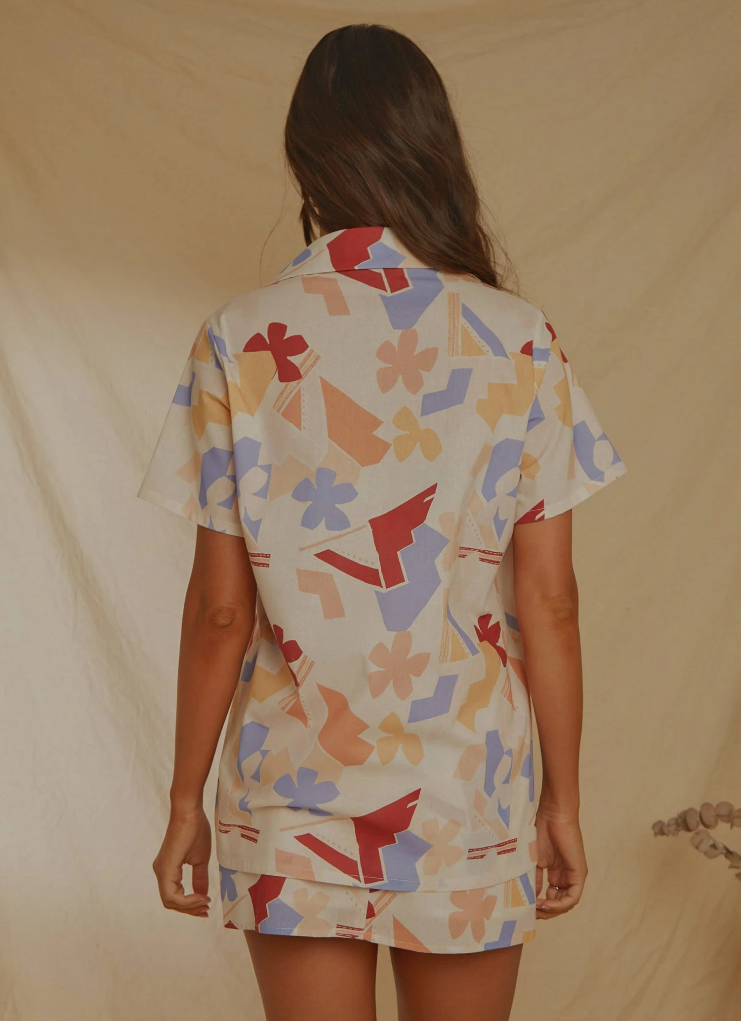 Cool girl vibes all summer long in the Sunset Apertivo Shirt. Featuring an abstract print, this shirt can be styled open with a cute crop or buttoned down with any bottom.