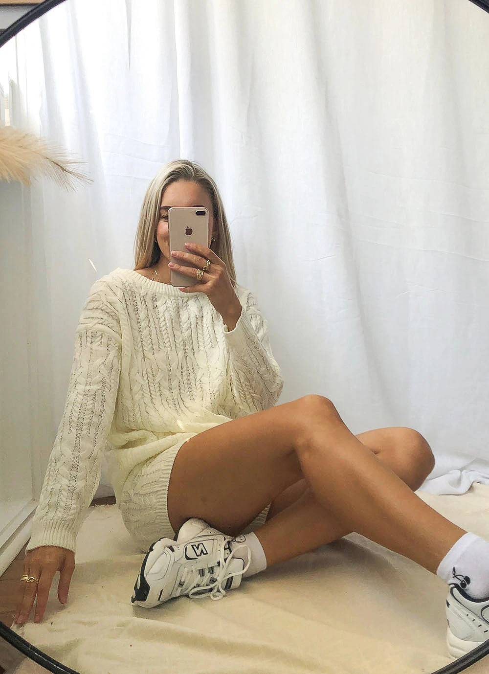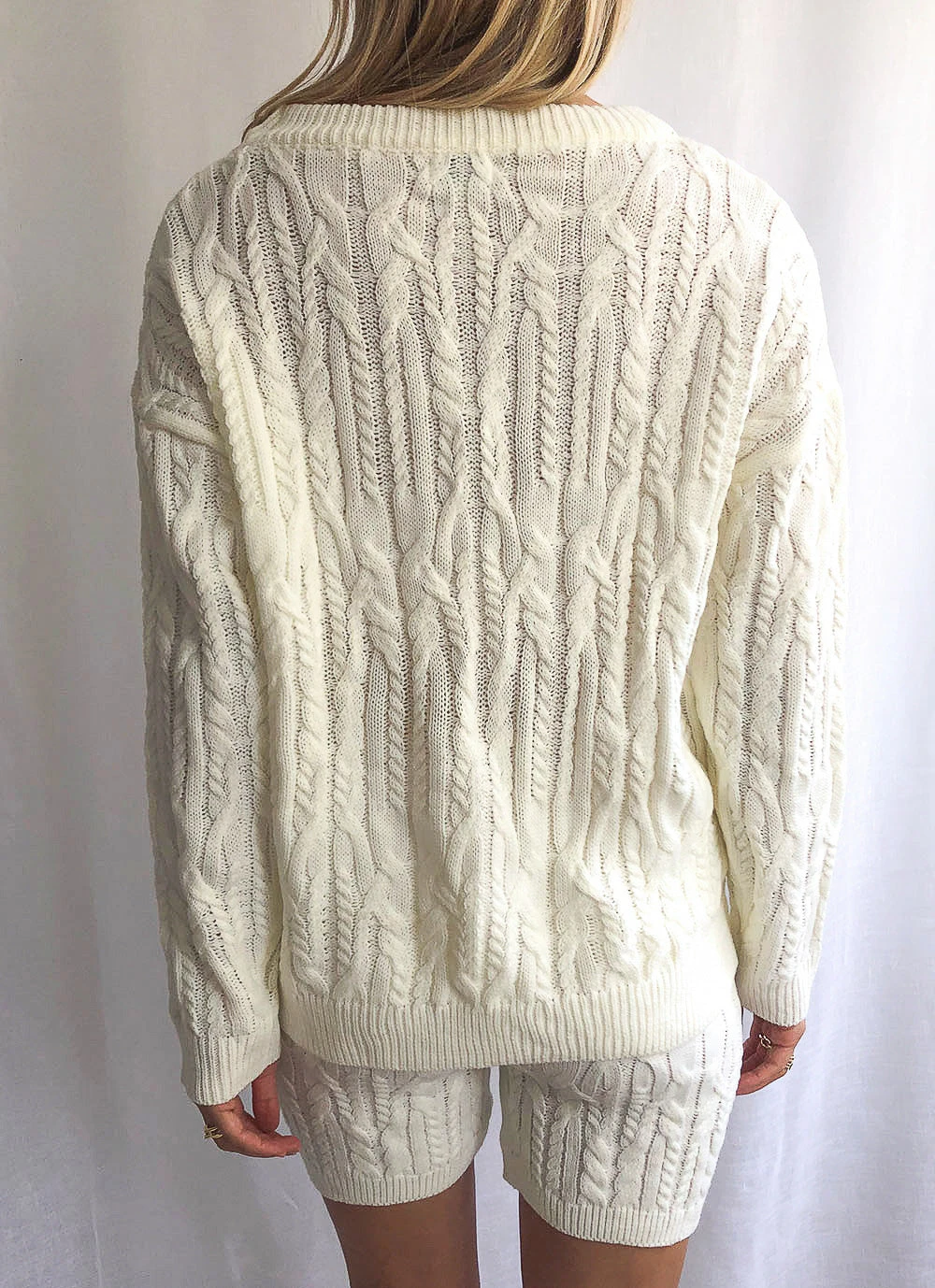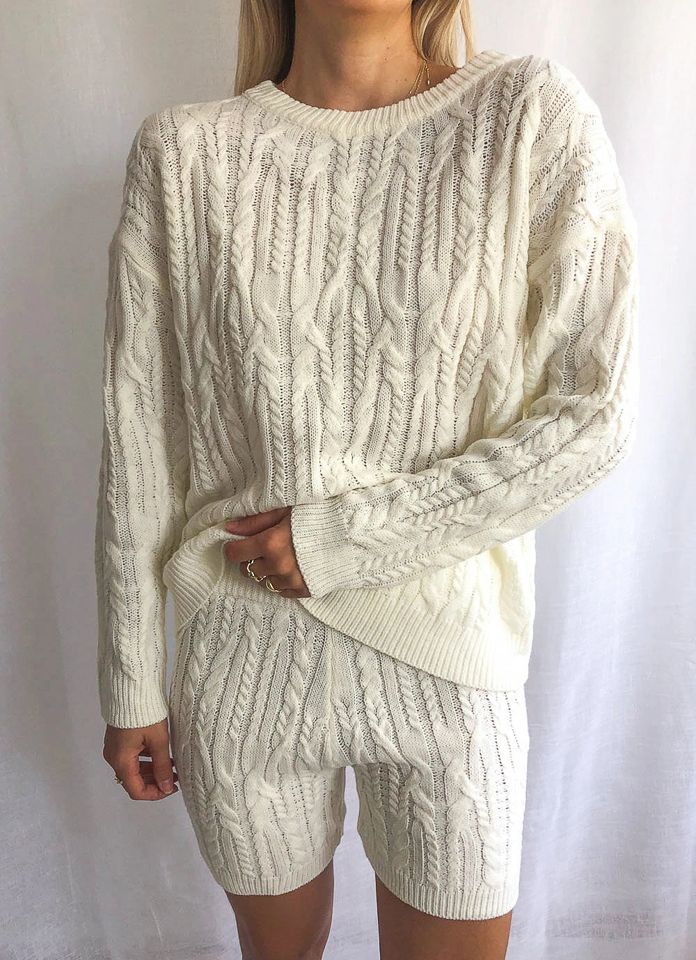 A classic slouchy fit Knitted jumper. We think it looks oh so cute with the matching shorts and sneakers. Throw on a coat over the top for a chic look.
