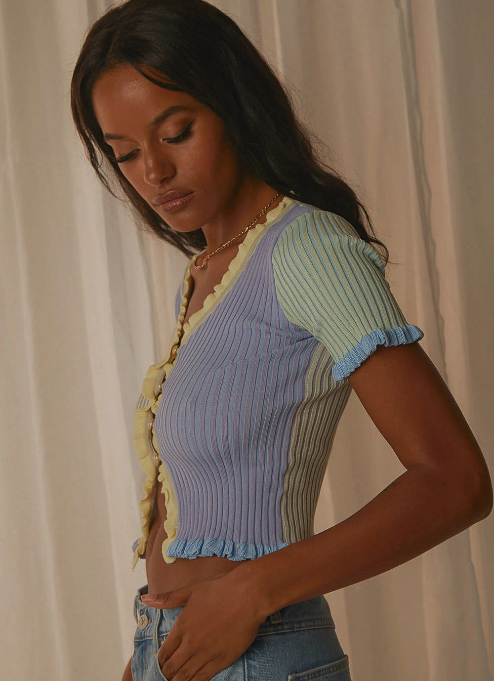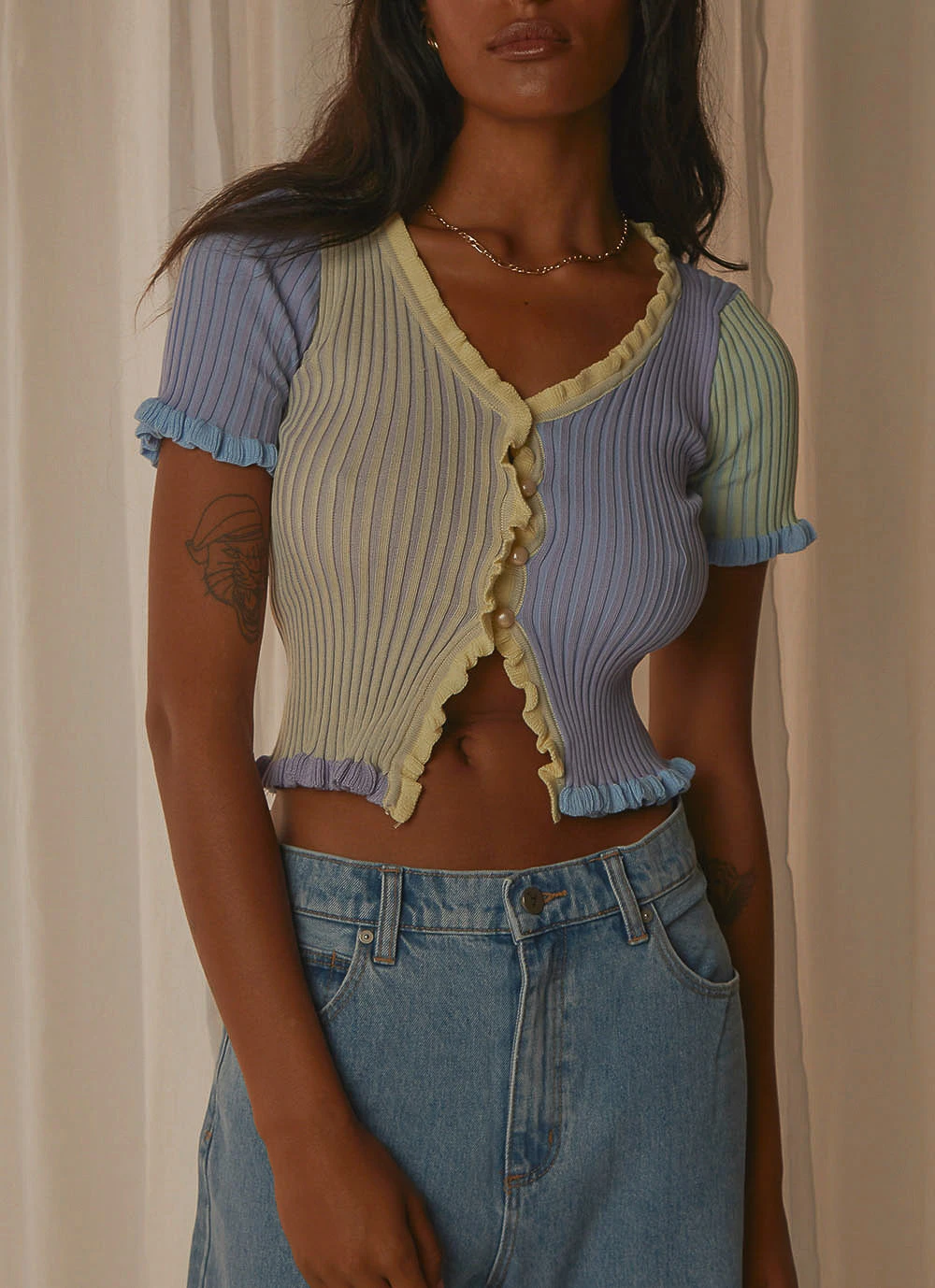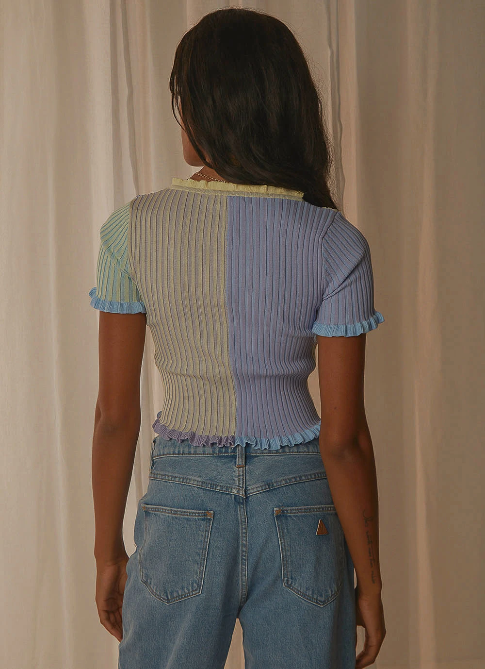A must this season, you’ll be wearing this crop everyday. We love it with high waisted denim or a mini skirt and mules.
