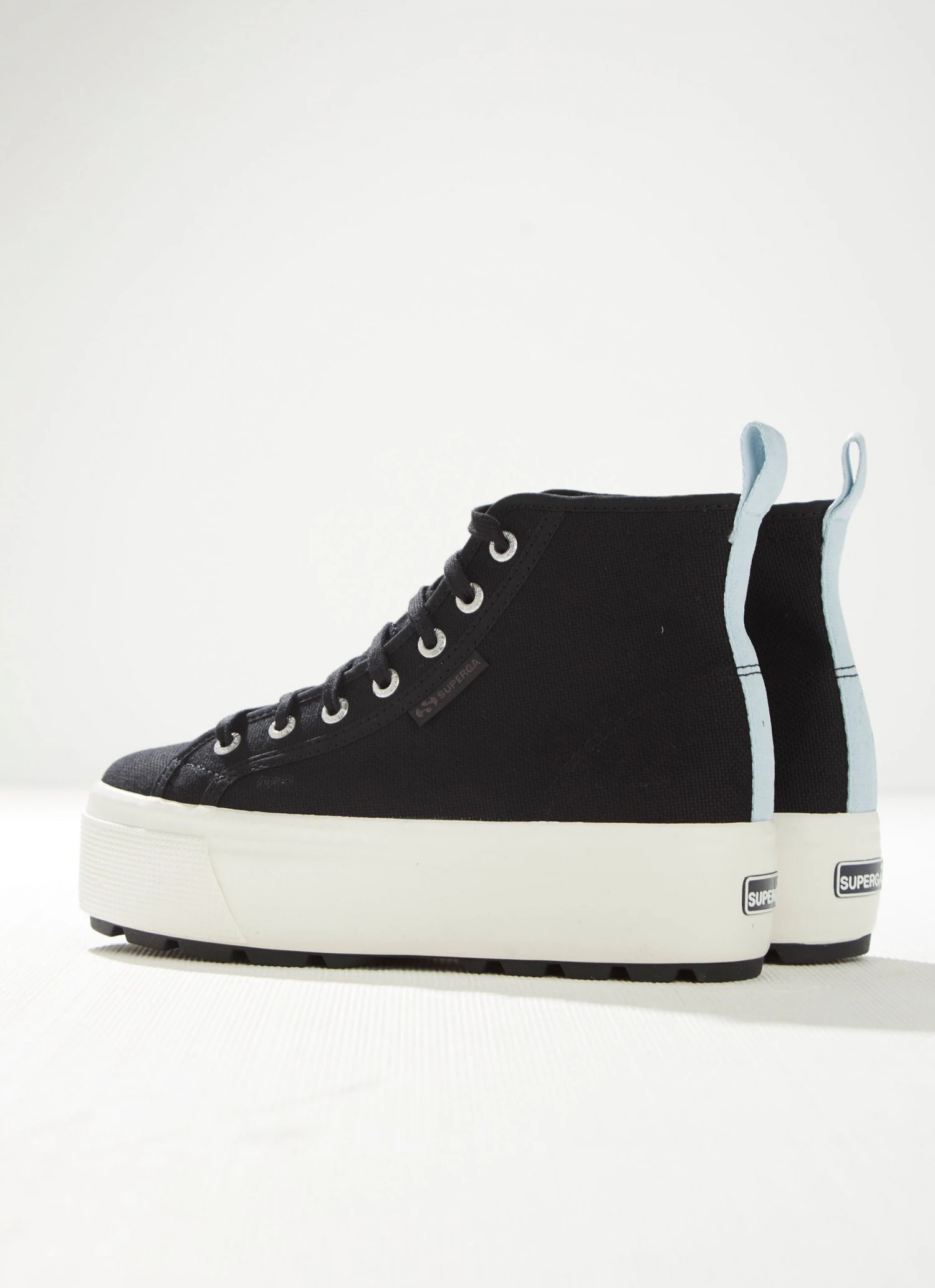 Superga for women with 4 cm wedge and upper in cotton and backtape colors. The Tank outsole, in moulded rubber, is a reboot of that has origins in the heritage of Superga.