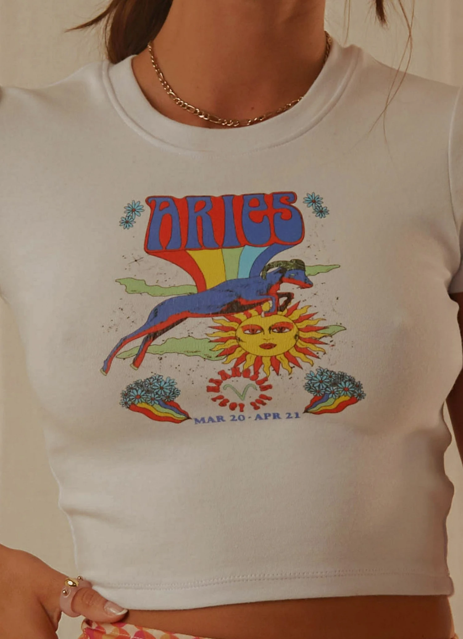 Aries (Ram) March 21st – April 19th. The Aries Zodiac Tee, a unique hand drawn graphic made for your sign. Wear your star sign on your sleeve with your personalised zodiac graphic. The perfect 90’s inspired baby fit tee made from 100% organic cotton.